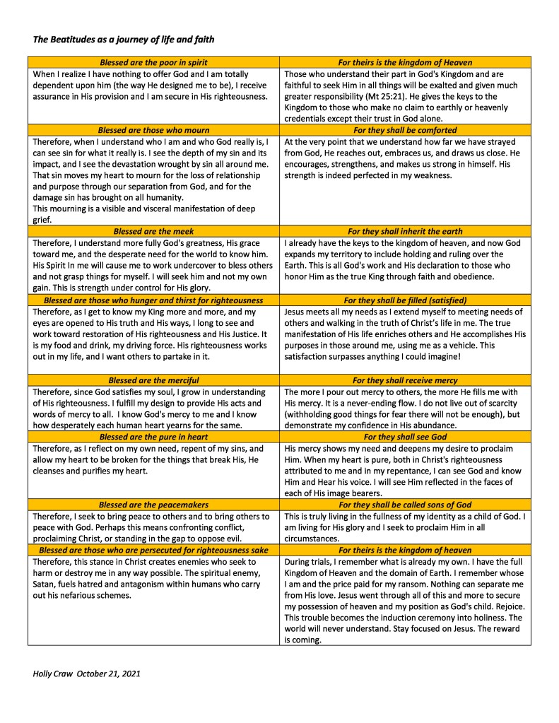 Have you ever read the Beatitudes in Matthew 5 and wondered what they mean and how they fit together? I am studying the whole book of Matthew and read this portion several times. I asked the Holy Spirit to show me something new and move my heart to align with Jesus. I share some of those gleanings in this video.